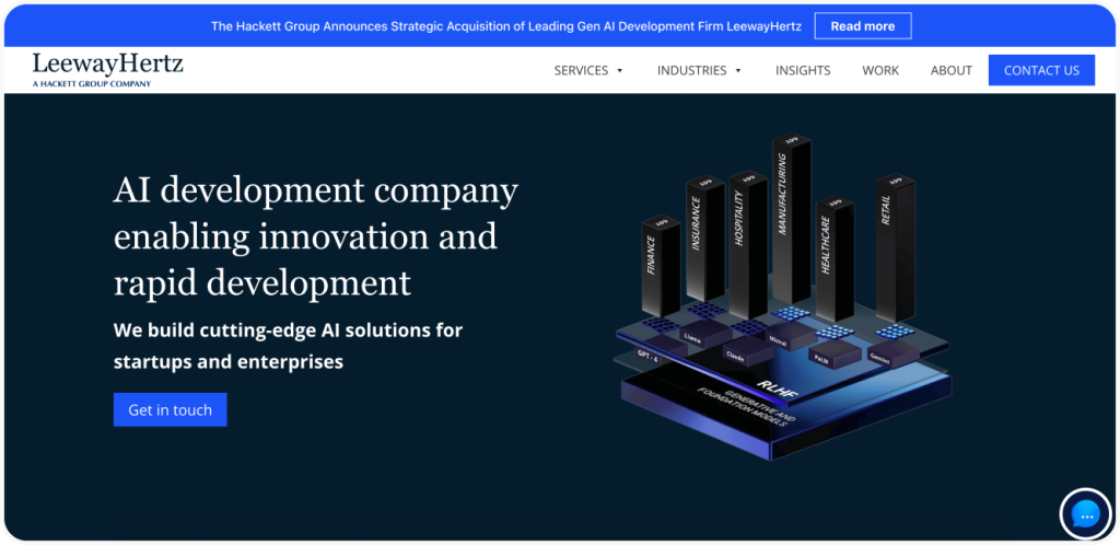 This AI provider specializes in collaborations with enterprise-grade companies, startups, and scaleups, offering a diverse list of AI-powered services. The solutions include AI-driven applications, engaging blockchain technologies, IoT systems, generative AI models, LLMs, and predictive analytics. LeewayHertz worked with clients within healthcare, financial, manufacturing, eCommerce, and other industries, so you can find a list of successful cases and collaborations with such trustworthy brands as Siemens, ESPN, and Shell.